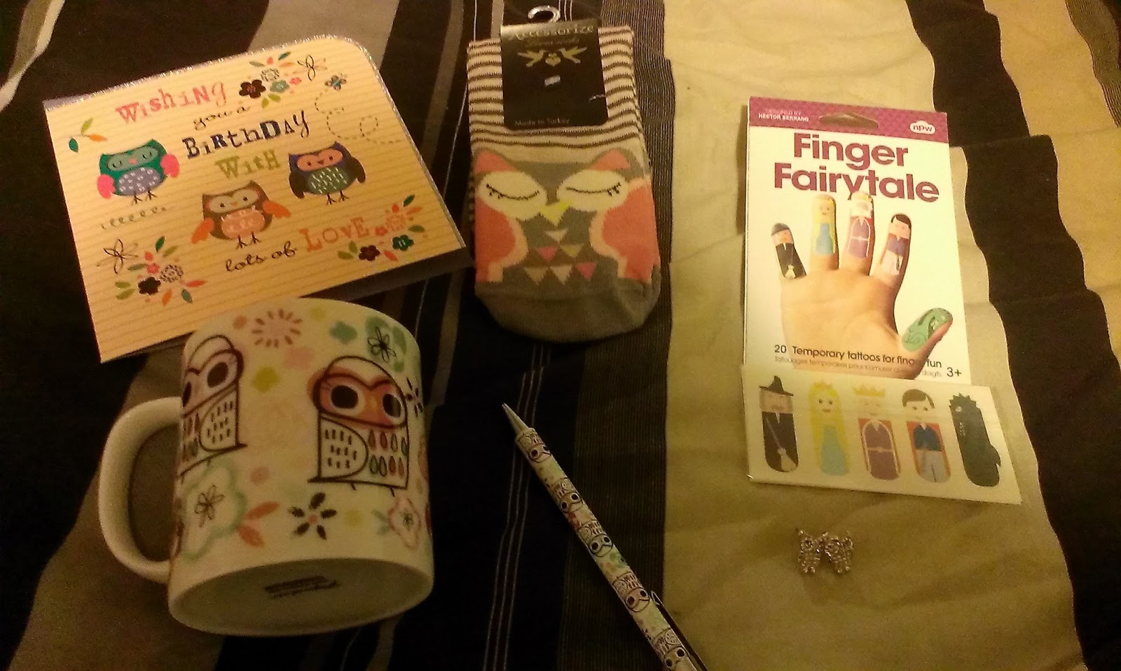 Not only did I get an owl mug, pen, birthday card and socks but the cutest earrings from Accessorize. I had to re-pierce my ears to get these in but I'm extremely glad I did as I have had them on every day since I got them. You can't see them very well in the picture above but I'll post a bigger one at the bottom of this post.